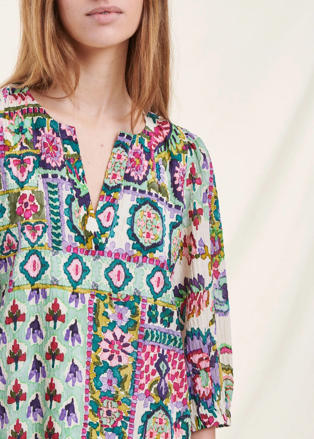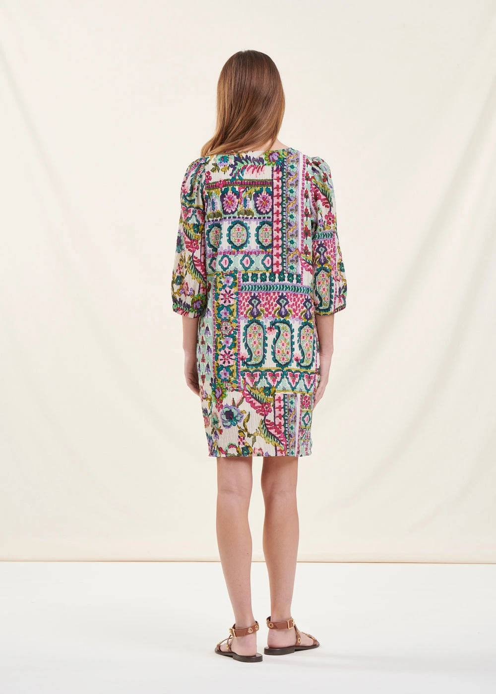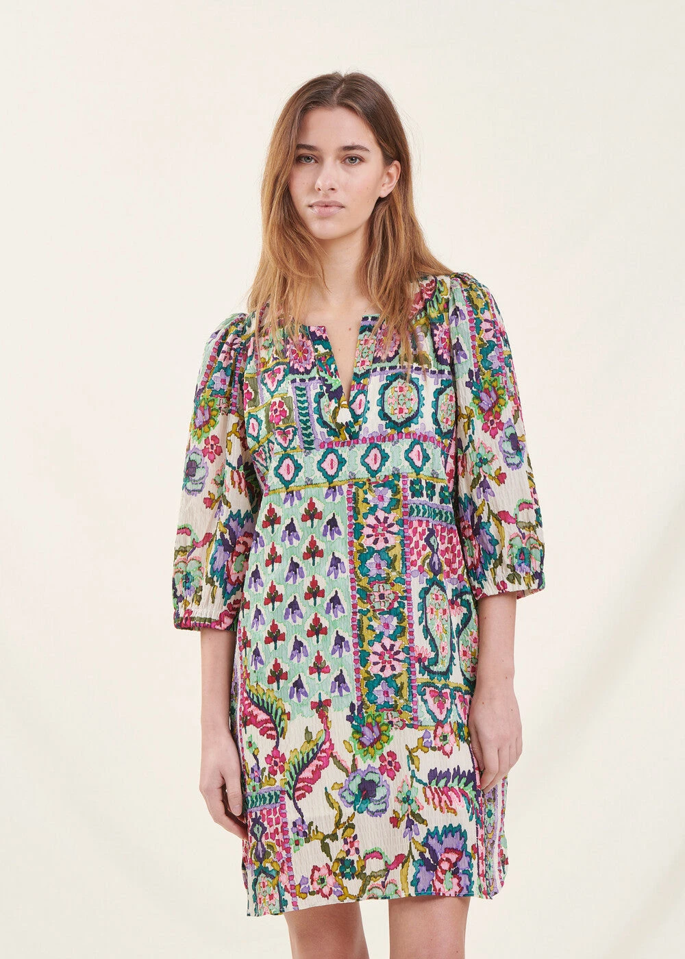 Robe Courte Bohème Bleu Et Rose En Coton Biologique Imprimé Ethnique